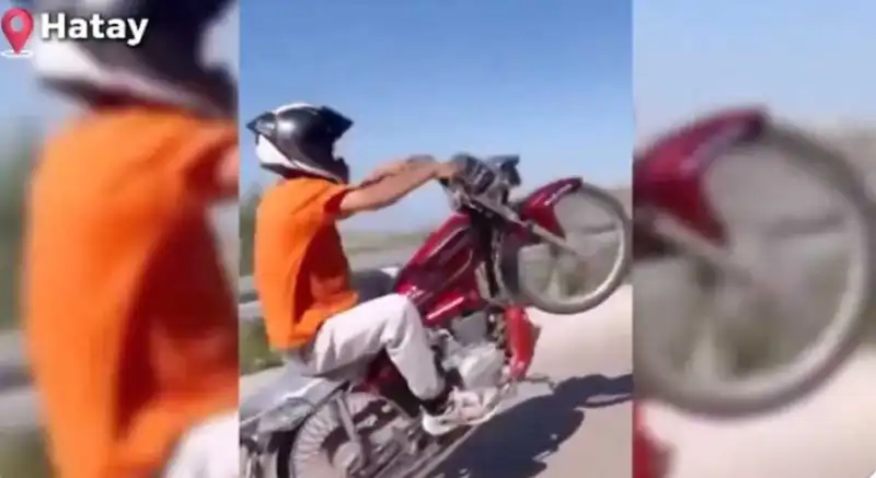 Antakya’da motosikletle seyir halindeyken akrobatik hareketler yapan ehliyetsiz sürücüye 77 bin 239 lira ceza uygulandı.